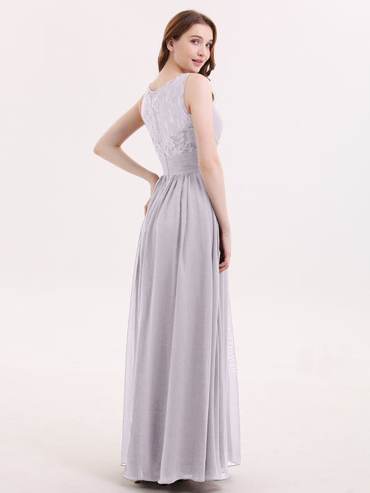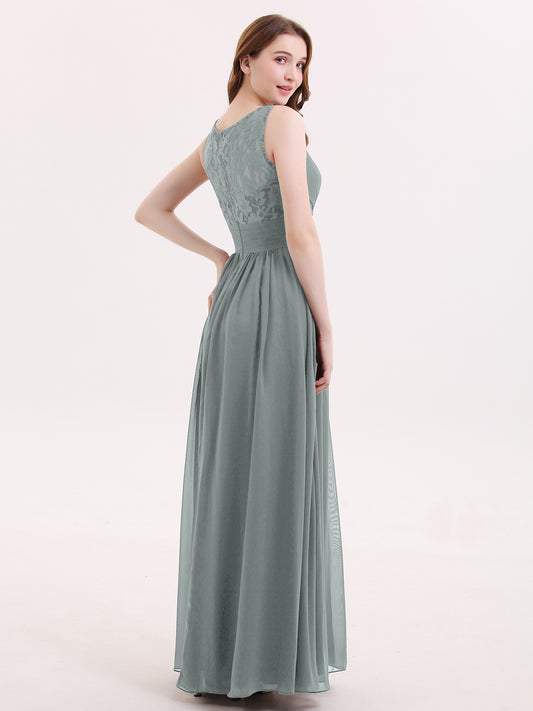 Babaroni AdalynAdalyn Escote En V Gasa Y Encaje Maxi Corte De Dama De Honor Gris Acero