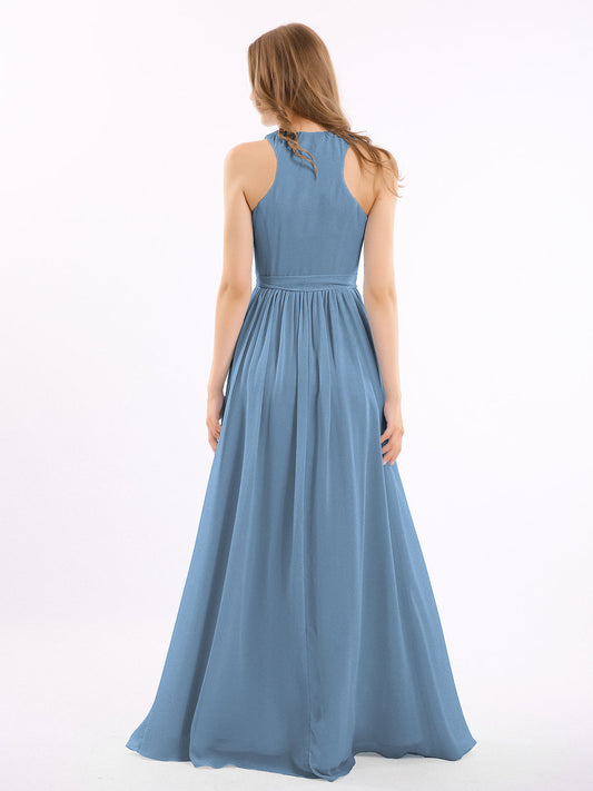 Babaroni AmeliaEl vestido de chiffon con escote en V profundo y lazo de sash Azul Polvoriento