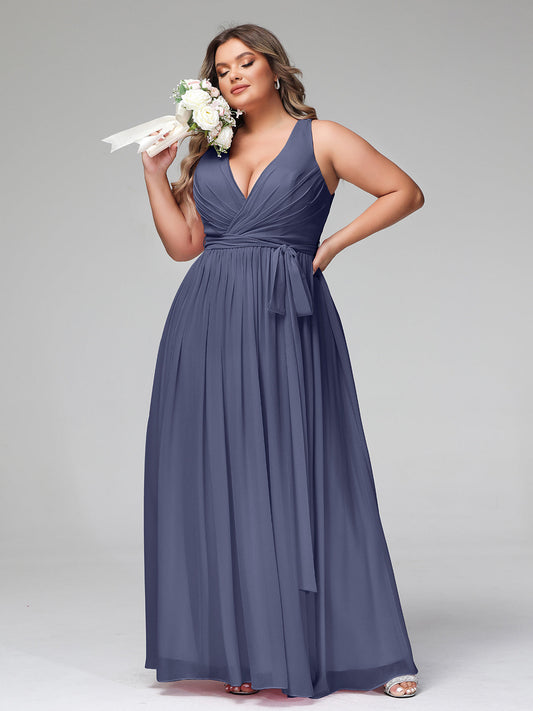 El vestido de chiffon con escote en V profundo y lazo de sash Tormenta Tallas Grandes