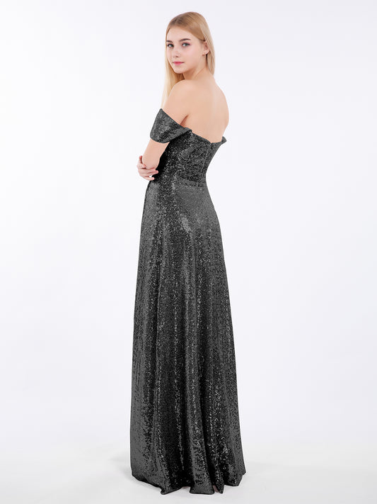 Babaroni AlvaAlva Largo Lentejuelas Vestido Con Fuera Del Hombro Negro