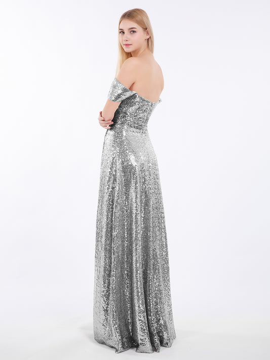 Babaroni AlvaAlva Largo Lentejuelas Vestido Con Fuera Del Hombro Plata