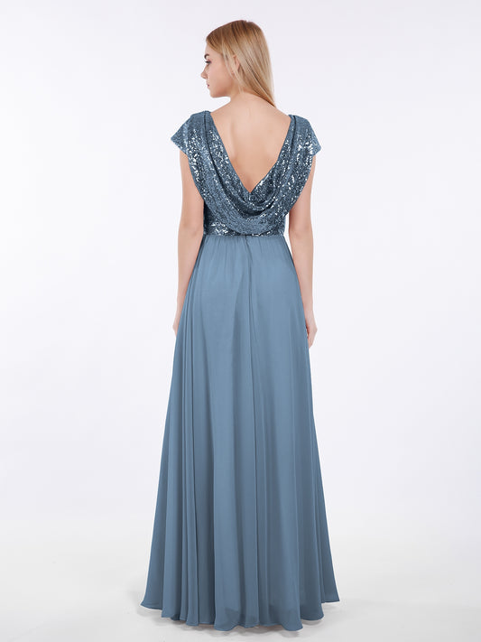 Babaroni AmarisAmaris Lentejuelas Largo Vestido Con Mangas De La Tapa Azul Pizarra