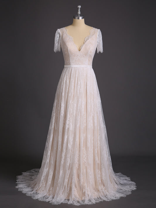 Babaroni HuldaHulda Escote En V Encaje Vestido De Novia Con Cortas Mangas Champán Tallas Grandes