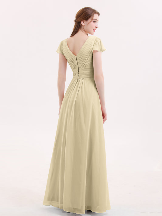 Babaroni JacquelineJacqueline Largo Gasa Vestido De Dama De Honor Con Mangas De La Tapa Champán
