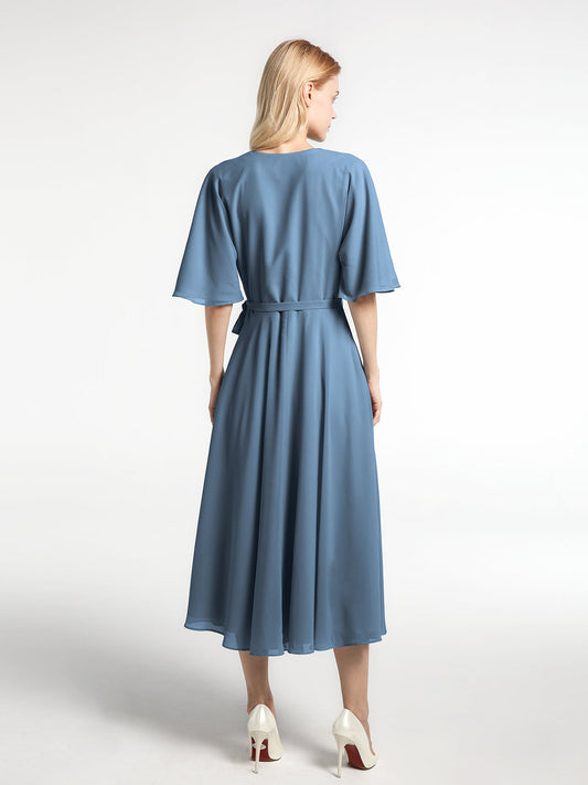 Babaroni ZonaVestido de chiffon con escote en V y mangas media longitud, a la altura de la rodilla Azul Polvoriento