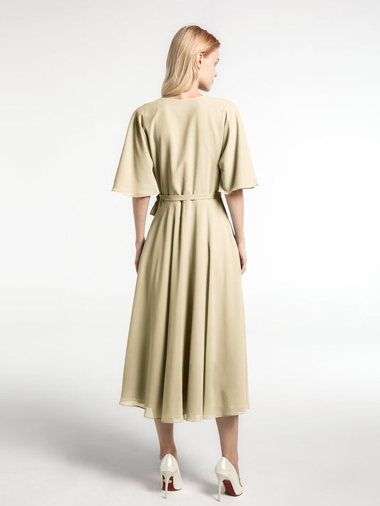 Babaroni ZonaVestido de chiffon con escote en V y mangas media longitud, a la altura de la rodilla Champán