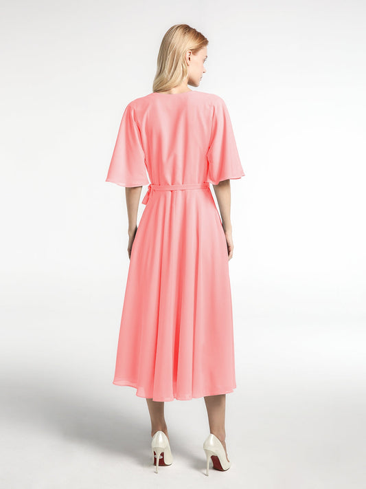 Babaroni ZonaVestido de chiffon con escote en V y mangas media longitud, a la altura de la rodilla Coral