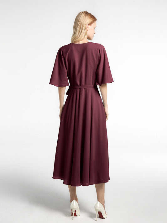 Babaroni ZonaVestido de chiffon con escote en V y mangas media longitud, a la altura de la rodilla Cabernet