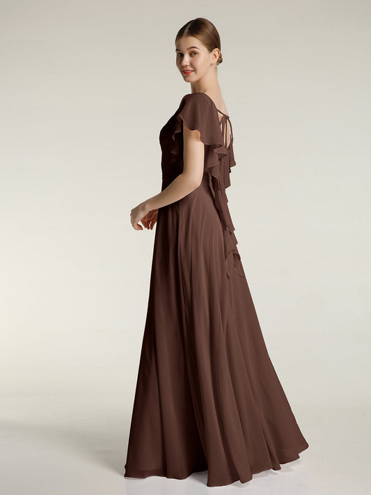 Babaroni RosaVestidos largos de dama de honor de chiffon con escote en Y y mangas de volantes Chocolate