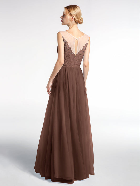 Babaroni PamelaVestido maxi de encaje y tul con escote ilusión Chocolate