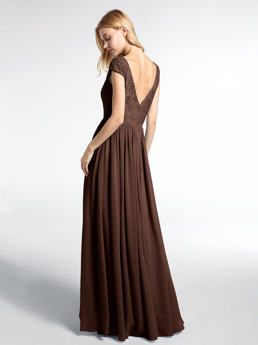 Babaroni SherryVestido maxi de encaje y chiffon con mangas cortas Chocolate