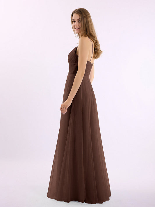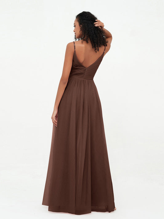 Vestidos largos de tul plisado con tirantes spaghetti Chocolate