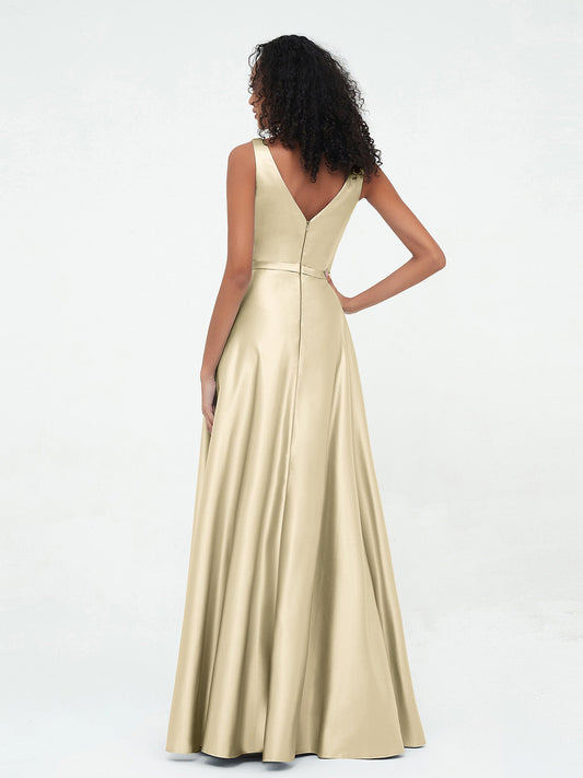 Babaroni RaeVestidos máximos de satén estilo A-line con escote en V y bolsillos Champán