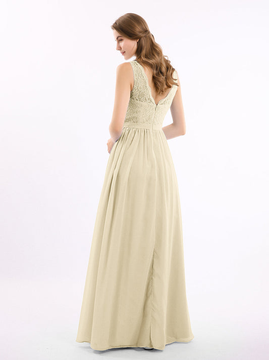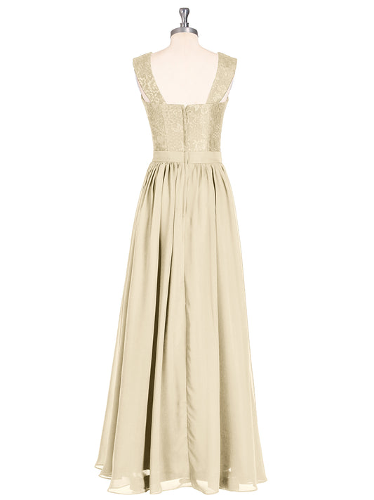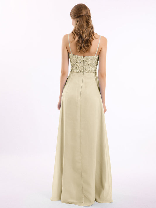 Babaroni CherryVestidos largos de encaje y chiffon con tirantes finos Champán