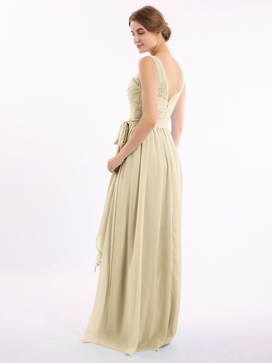Babaroni LindaVestidos largos de chiffon con tirantes de encaje y lazo de cinturón Champán