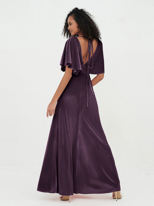 Vestidos largos de terciopelo de corte recto con mangas de volantes Ciruela