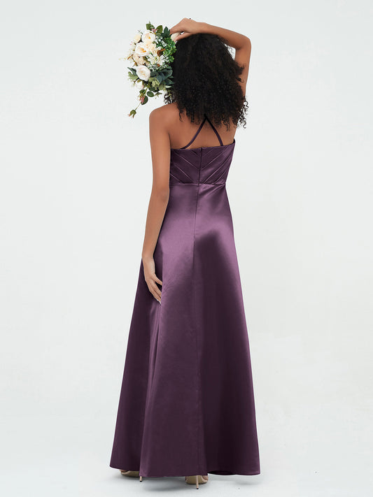 Vestidos largos de dama de honor de chiffon con tirantes de cuello halter Ciruela