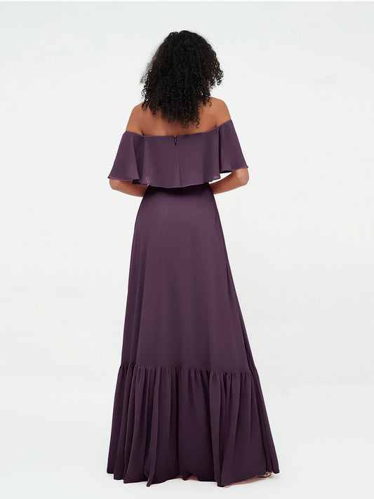 Vestidos máximos de chiffon con falda escalonada estilo off shoulder Ciruela