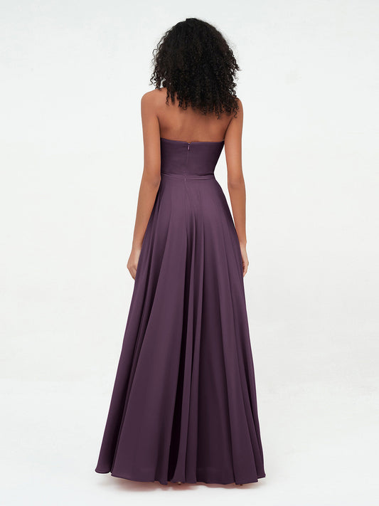 Vestidos largos de chiffon sin tirantes y escote corazón Ciruela