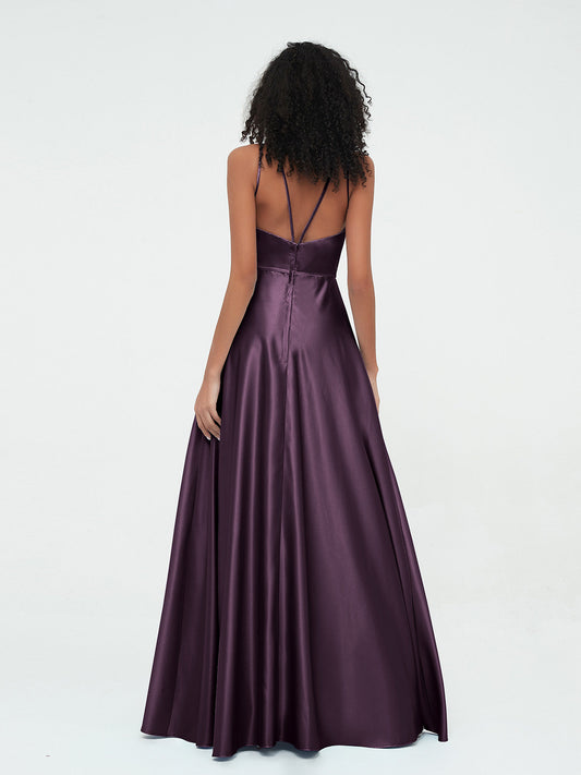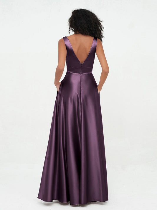 Babaroni SadeVestidos máximos de satén estilo princesa con escote en V y bolsillos Ciruela
