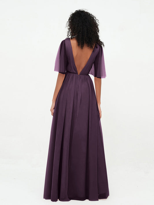 Babaroni KatherineVestidos máximos de tul estilo A-line con escote en V profundo en la espalda Ciruela