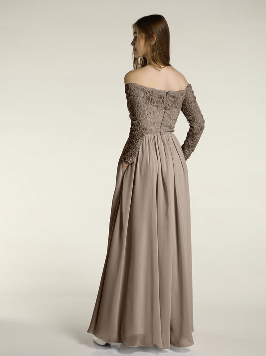 Babaroni MeilaniVestidos de encaje y chiffon con mangas largas y bolsillos Topo