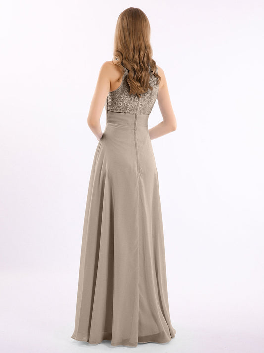 Babaroni LucilleVestidos largos de chiffon con encaje en escote en V profundo y espalda descubierta Topo