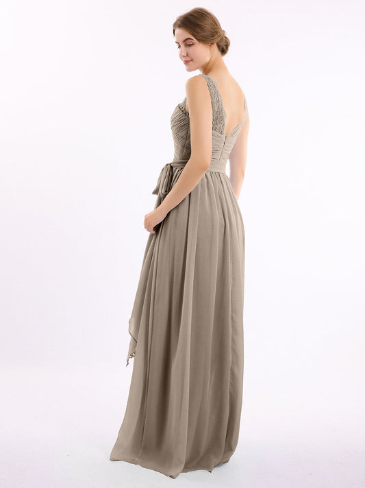 Babaroni LindaVestidos largos de chiffon con tirantes de encaje y lazo de cinturón Topo