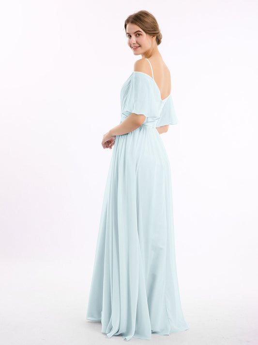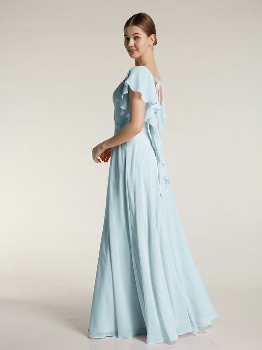 Babaroni RosaVestidos largos de dama de honor de chiffon con escote en Y y mangas de volantes Niebla