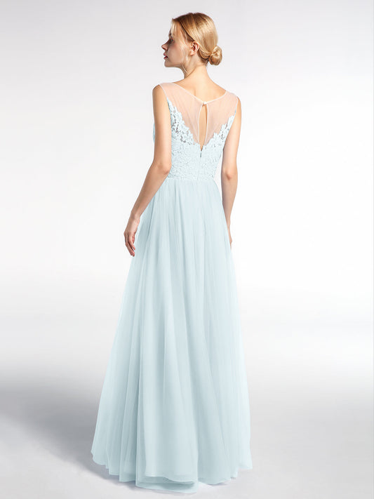 Babaroni PamelaVestido maxi de encaje y tul con escote ilusión Niebla