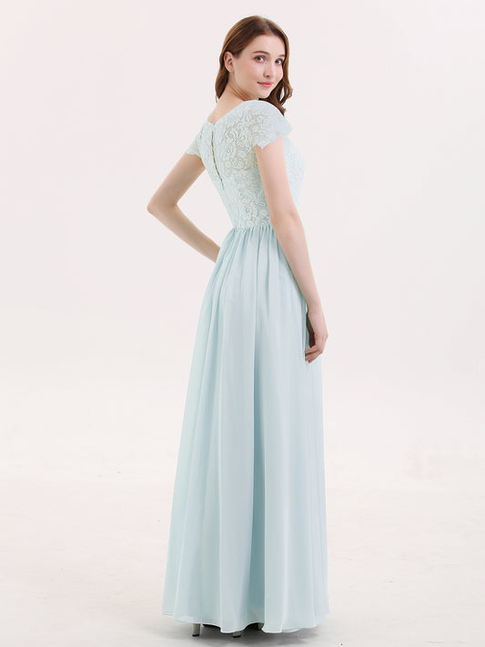 Babaroni SherryVestido maxi de encaje y chiffon con mangas cortas Niebla