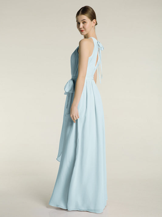 Babaroni JaneVestidos largos de chiffon estilo halter con lazo Niebla