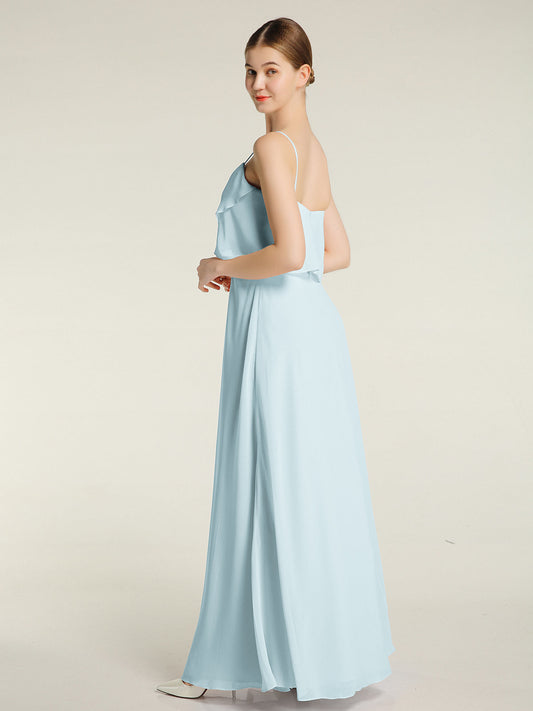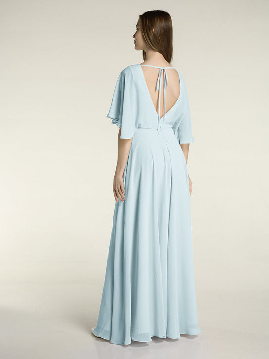 Vestidos largos de dama de honor de chiffon con mangas de volantes Niebla