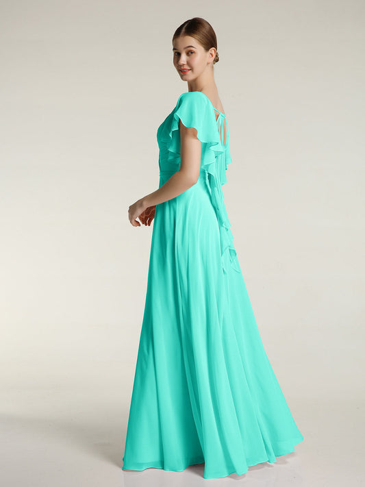 Babaroni RosaVestidos largos de dama de honor de chiffon con escote en Y y mangas de volantes Spa
