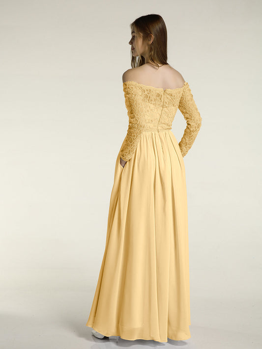 Babaroni MeilaniVestidos de encaje y chiffon con mangas largas y bolsillos Oro