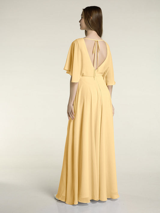 Babaroni MignonVestidos largos de dama de honor de chiffon con mangas de volantes Oro