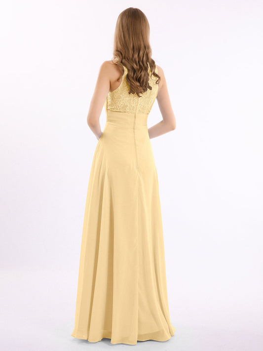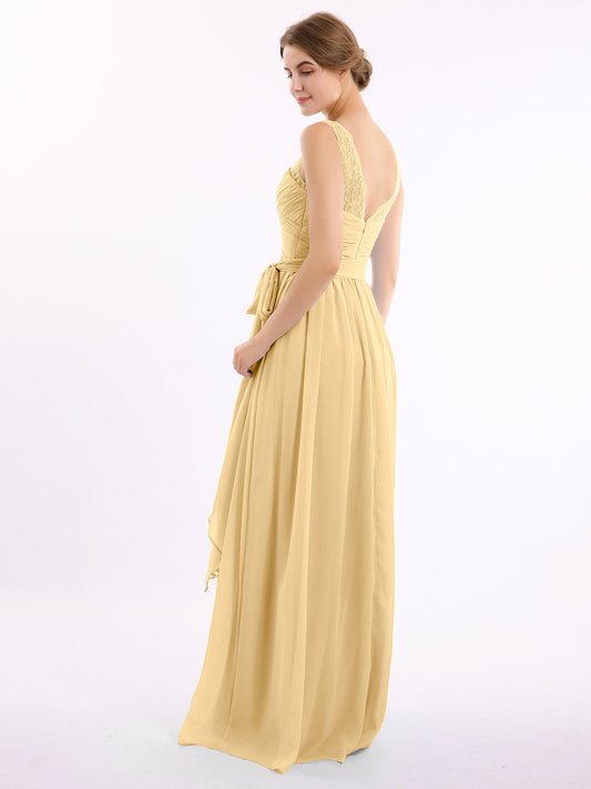 Babaroni LindaVestidos largos de chiffon con tirantes de encaje y lazo de cinturón Oro