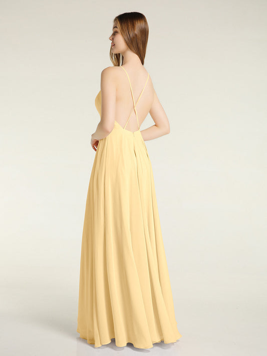 Babaroni MaudSencillos vestidos largos de chiffon con tirantes finos y abertura Oro