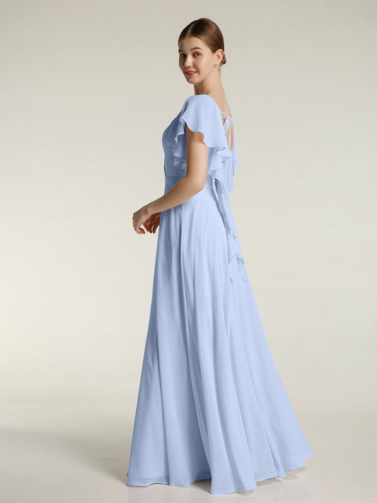 Babaroni RosaVestidos largos de dama de honor de chiffon con escote en Y y mangas de volantes Azul Cielo