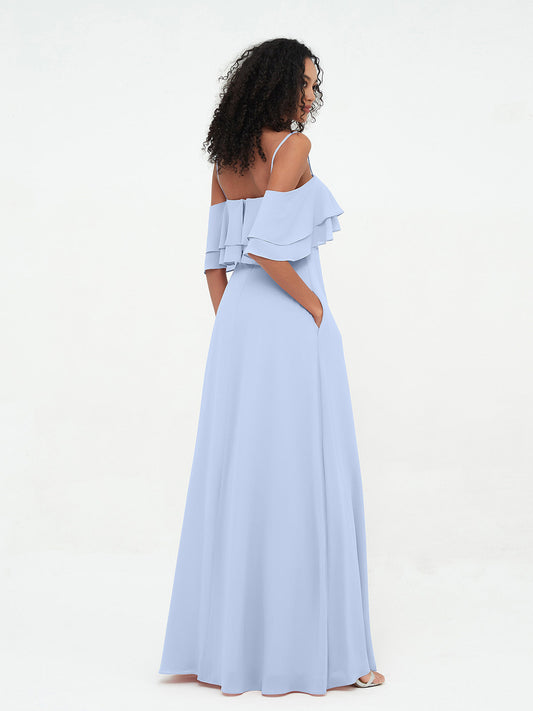 Babaroni MaudSencillos vestidos largos de chiffon con tirantes finos y abertura Azul Cielo