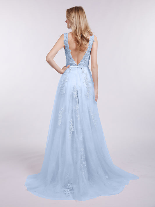 Babaroni LucilleVestidos largos de chiffon con encaje en escote en V profundo y espalda descubierta Azul Cielo