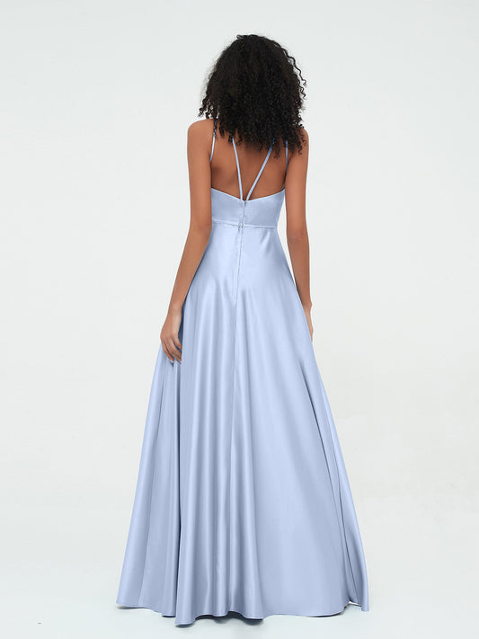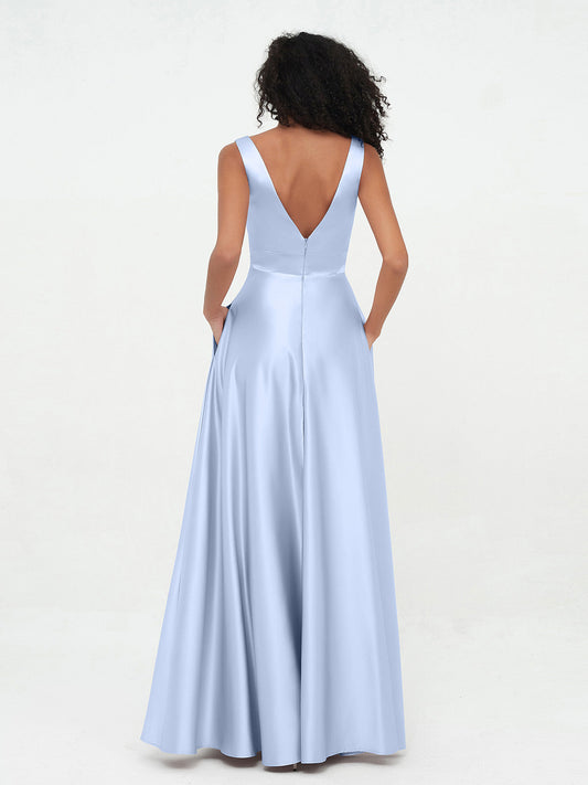 Babaroni SadeVestidos máximos de satén estilo princesa con escote en V y bolsillos Azul Cielo