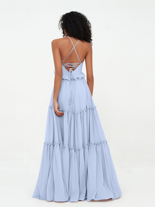 Babaroni UrsulaVestidos máximos bohemios de chiffon con falda escalonada estilo Empire Azul Cielo