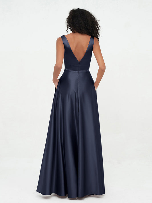 Babaroni SadeVestidos máximos de satén estilo princesa con escote en V y bolsillos Azul Marino