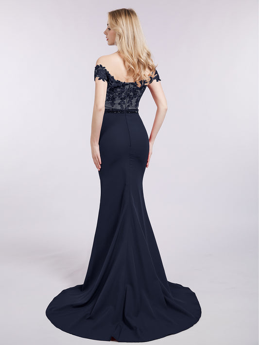 Babaroni NoraNora Fuera Del Hombro Sirena Corte Con Tren Azul Marino