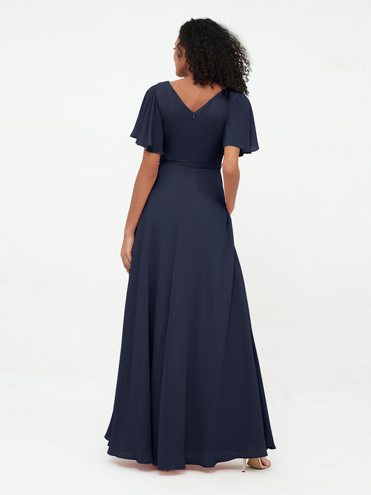 Babaroni YvetteVestidos máximos de chiffon con mangas de volantes y lazo en la cintura Azul Marino