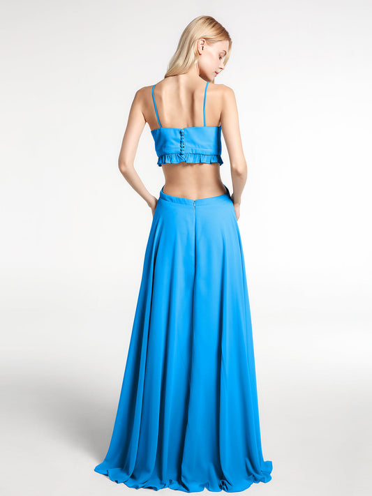 Babaroni EudoraVestido sexy maxi de chiffon con tirantes finos y detalles de volantes recortados Azul Océano
