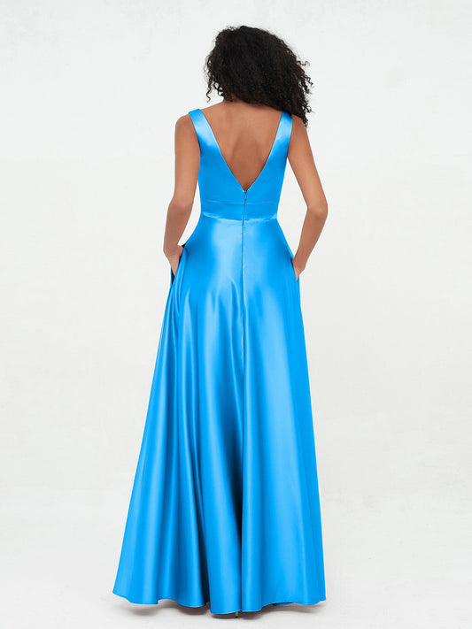Babaroni SadeVestidos máximos de satén estilo princesa con escote en V y bolsillos Azul Océano