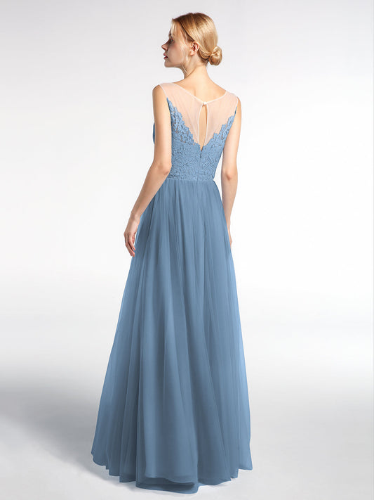 Babaroni PamelaVestido maxi de encaje y tul con escote ilusión Azul Pizarra