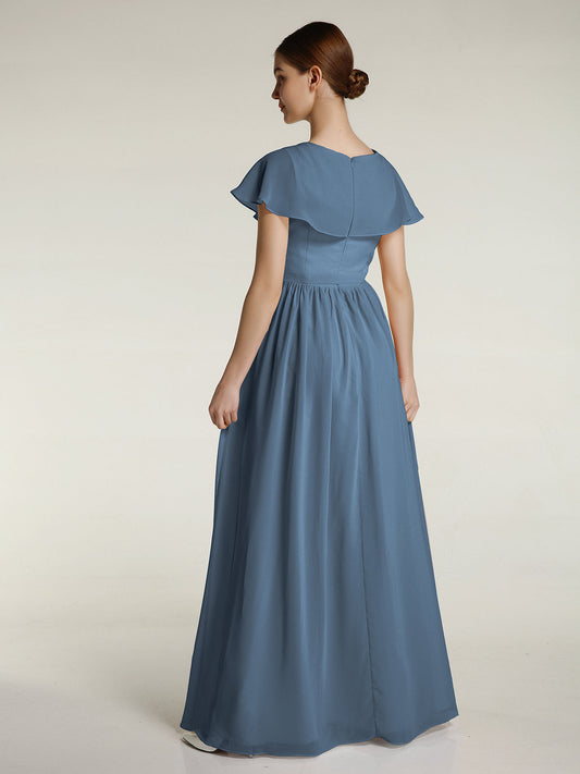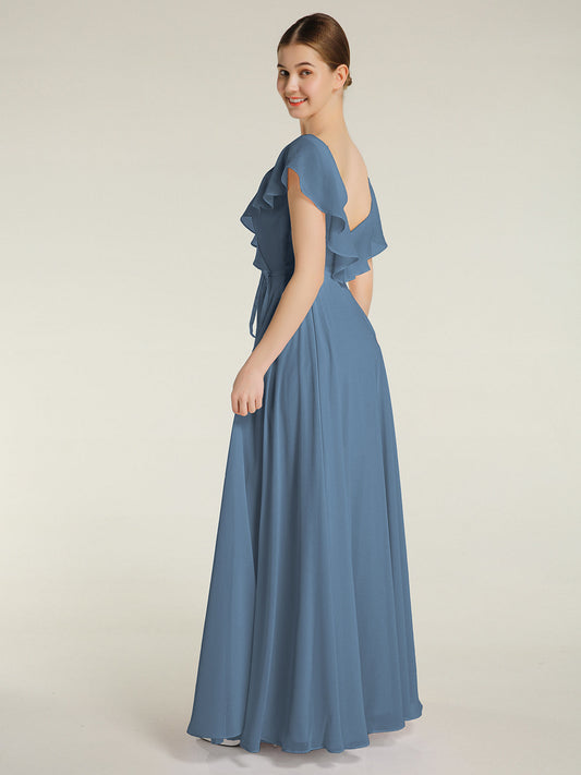 Babaroni MignonVestidos largos de dama de honor de chiffon con mangas de volantes Azul Pizarra